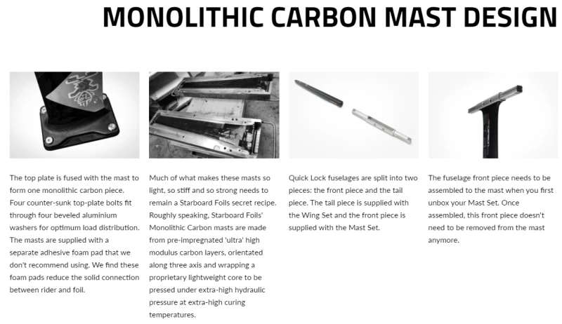 Other Parts: A set of Torx bolts for attaching the fuselage front piece to the mast, 4x Top Plate bolts for attaching the foil to your board and 1x Torx Key. The Monolithic Carbon mast set also includes 4x 3D washer sets.